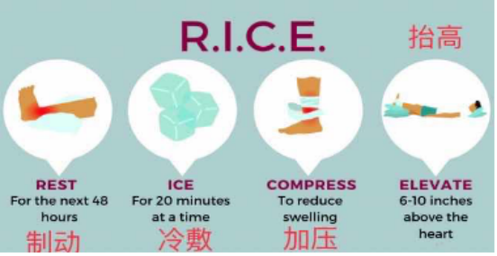 04 急性出血怎么办? 应及早或就近接受专业救治,并坚持RICE(“冷静高压”)原则,先行自我救助。具体为:制动(REST),受伤后立即停运动,冰敷(ICE),马上冰敷受伤部位,加压(Compression),对受伤部位使用弹力绷带等适当进行加压包扎,减少出血渗出,抬高(Elevation),抬高受伤部位,有利于血液回流,减少出血渗出。