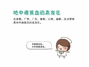 3、只有南方人才会地贫吗? 地贫是全球分布最广、累及人群最多的一种单基因遗传病,主要见于地中海沿岸国家和东南亚各国。我国长江以南的广大区域地贫高发,其中以广西、广东和海南三省(区)为甚,其他还有云南、贵州、福建、江西、湖南、四川、重庆、香港、台湾等省(区、市)。我国北方则主要见于古“丝绸之路”的陕西、甘肃、新疆一些地区,推测与东西方人群交流有关。近年来随着经济社会发展和改革开放,人口流动频繁,湖北、江苏、浙江、上海和北京等省(市)也出现少量病例。