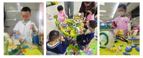 2、开展趣味游戏治疗: (1) 我是小医生、小护士 我们为住院的患儿准备了小小的白大褂和护士服,小小的他们穿上白大褂、护士服,模拟为布娃娃测体温、听诊、打针、检查等。这个活动版块不但能使孩子们正确认识疾病和疼痛,同时也认识了一些常用的医疗用品,孩子们体验了游戏带来的欢乐后也渐渐地不再那么恐惧,慢慢地接受和配合临床检查、治疗。