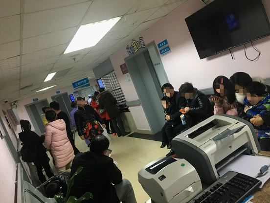 在儿科门诊部,不止医生诊室,连护士站也长期围满了患儿家属,有的在询问病情,有的在催促医生、护士进行治疗;在儿科住院部更是人满为患,大厅靠墙的加床摆了长长一条,只剩下一条狭窄走道,最多时新增了60张病床,病人量比平时翻了一番。患儿有的哭闹、有的昏睡、有的呕吐、有的咳嗽不止,患儿家属的脸上也写了满疲惫与不安。