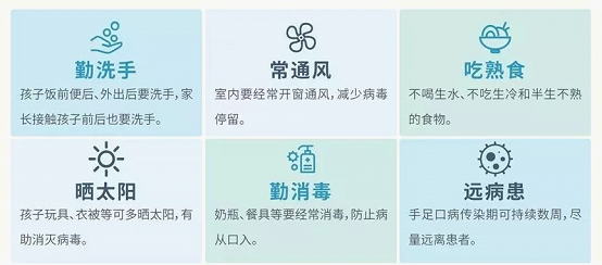 4.注意消毒 肠道病毒在 4℃ 可存活 1 年,在 -70℃ ~ -20℃ 仍可长期存活,在外环境中病毒可长期存活,但不耐高温。患儿玩过的玩具、用过的奶具、碗筷或其他衣物等生活用品都应彻底消毒。 (1)紫外线照射: 如有条件,可以用紫外线灯直接照射 0.5 ~ 1.0 小时,但只限于光线所能照射到的物体表面; (2)阳光暴晒消毒: 有阳光普照时可以将需要消毒的物品放置于太阳底下暴晒 0.5 ~ 1.0 小时,但只限于阳光所能照射到的物体表面; (3)家长自身也需消毒: 家长或照顾者在接触患儿前后、给患儿更换尿布/尿不湿和处理大便后都应戴手套或注意用肥皂和清水洗手。
