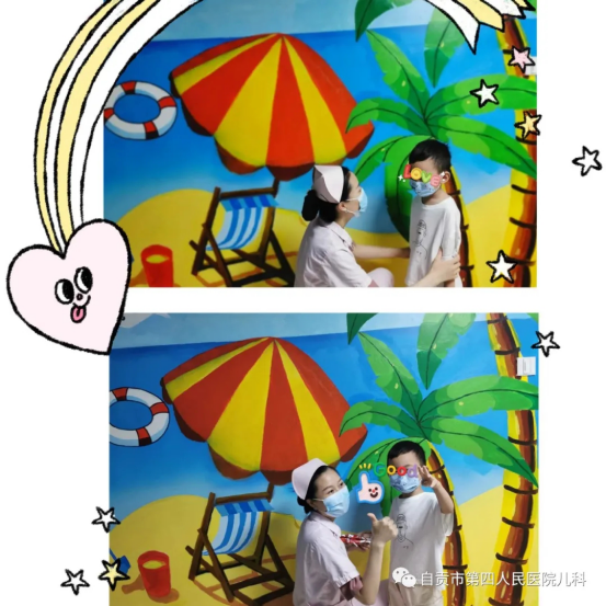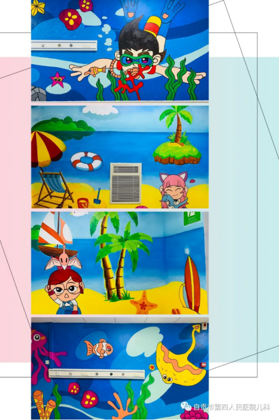 蓝色的海底世界,正代表着健康、平和、希望梦想,可以使儿童的紧张情绪有利于放松和缓解,促进疾病的康复。绿色的小树和海草,代表着顺畅生活、健康呼吸,能够安抚情绪,对哮喘、咳嗽患儿都比较适宜。黄色的沙滩和鱼类,代表着爱和活力,活力未来,使疼痛有利于缓解,心脏跳动更有力,给人安抚宽慰,对疾病的恢复起到调节作用。