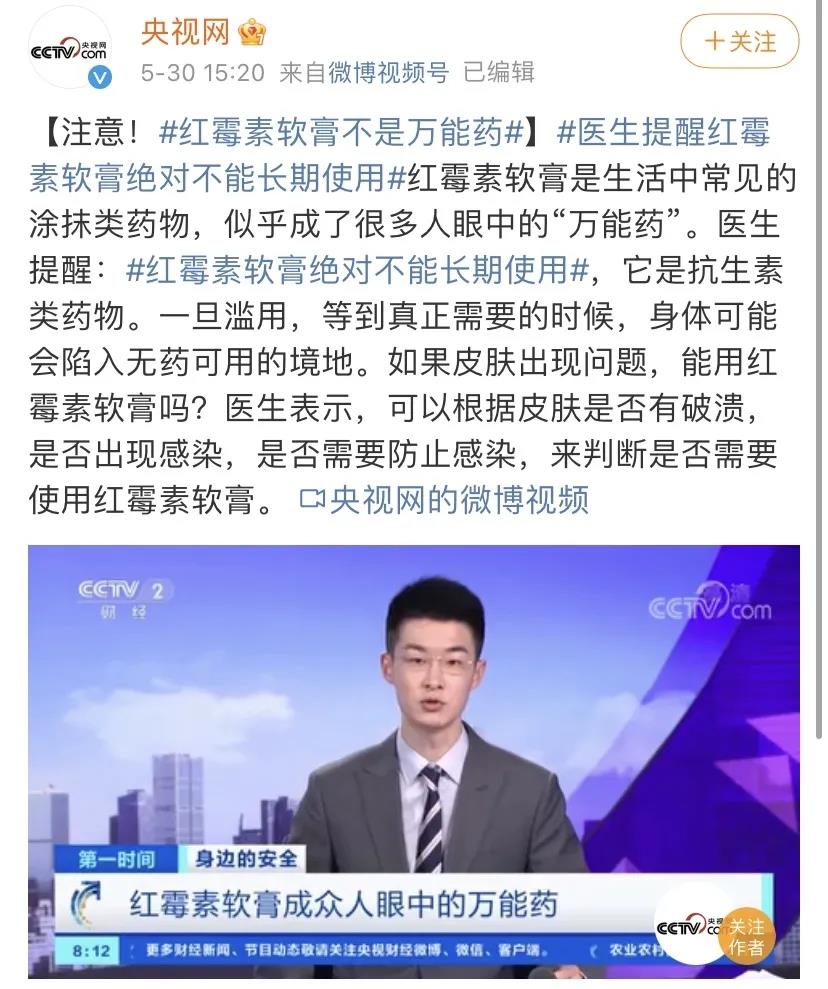 但前段时间,它被央视等多家媒体「点名」,上了热搜——#红霉素软膏不是万能药#,红霉素软膏绝对不能长期使用。