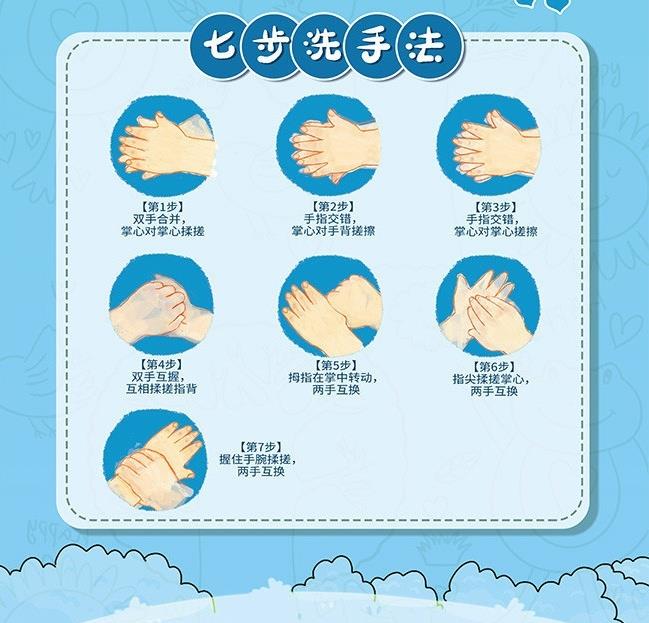 1.家长应引导孩子用“七步洗手法”在流动水下用洗手液或是肥皂科学的洗手。