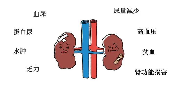 ● 泡沫尿,提示存在蛋白尿可能。 ● 水肿,手部、面部、双下肢或腹部水肿 ● 乏力 ● 尿量减少 ● 检查发现高血压或贫血 ● 出现肾功能损害