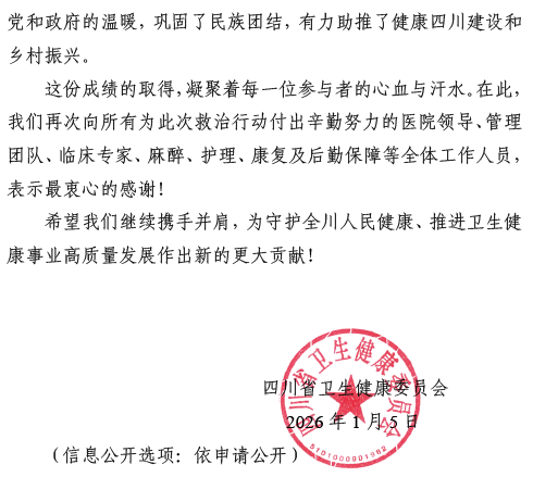 近日,四川省卫生健康委员会向我院发来感谢信,高度肯定我院在2025年“骨病清零精准护航”阳光行动—阿坝州大骨节病精准救治工作中的重要贡献。信中特别赞扬我院骨科团队以高度的专业精神与技术担当,深入高原一线,为地方病患者送去健康与希望,彰显了医院在骨科疾病诊疗领域的深厚实力与社会责任感。