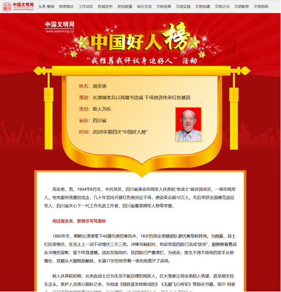 周全弟,男,1934年6月生,中共党员,四川省革命伤残军人休养院“老战士”宣讲团成员,一级伤残军人。他克服伤残重拾信念,几十年坚持开展红色宣讲近千场,感染受众超10万人。先后荣获全国模范退役军人、四川省关心下一代工作先进工作者、四川省最美拥军人物等荣誉。