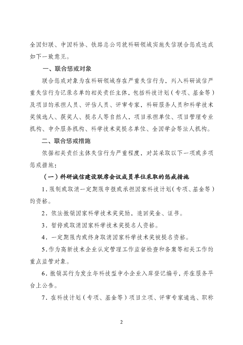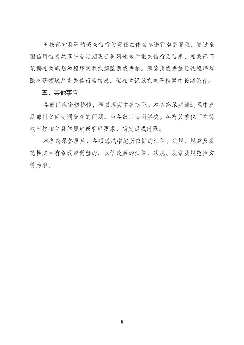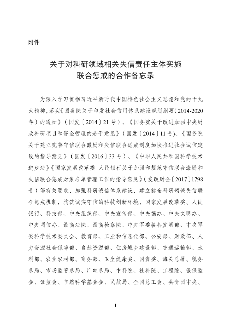 《关于对科研领域相关失信责任主体实施联合惩戒的合作 备忘录》