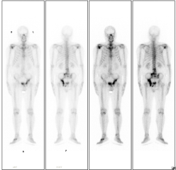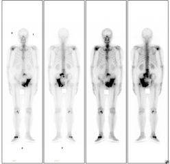 患者老年男性,因前列腺癌骨转移伴明显疼痛,于2022年8月行全身骨显像,后给予锶89及唑来膦酸等联合治疗,疼痛明显缓解,于2023年5月行全身骨显像复查,病灶明显减少、范围缩小、病灶活跃程度减低。