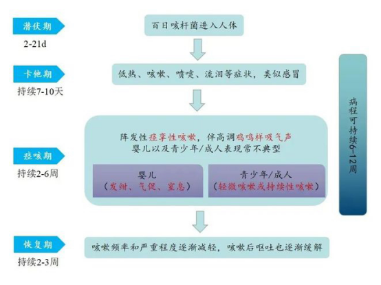 百日咳是由百日咳杆菌引起的急性呼吸道传染病,临床特点为阵发性、痉挛性咳嗽,以及咳嗽终止时伴有鸡鸣样吸气吼声为特征。该病病程较长,如未经治疗,咳嗽症状可持续约2-3个月,故名“百日咳”。百日咳病原菌是百日咳鲍特菌,又称百日咳杆菌。