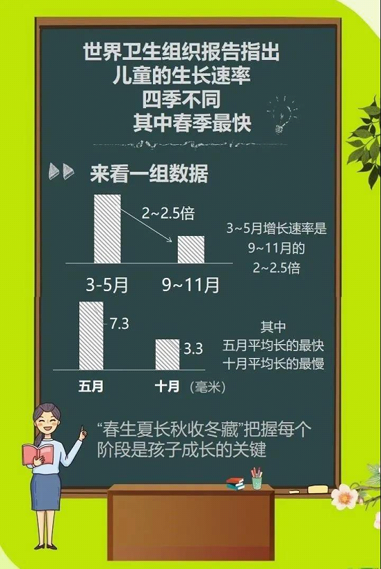 眼下已经进入春季,万物复苏。据世界卫生组织报告,儿童的身高增长速度在春夏秋冬都是不一样的,平均下来一年中长得最快是3-5月,身高增长是9-11月的2-2.5倍。学龄前的宝宝每年长高5公分才是正常的。所以,家长们要把握好春季长高的黄金期,宝贝们才能像“雨后春笋”般快速长高个儿。