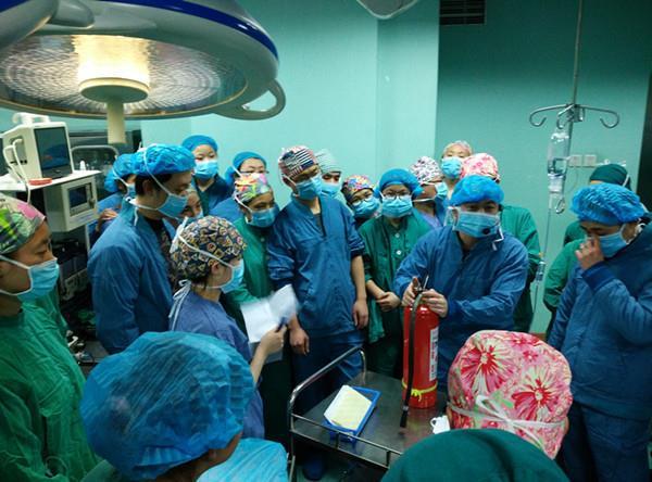 演练地点在医院住院部十四楼,假设手术室急诊间电路设备老化引起电线短路,发生火灾。火势燃烧猛烈,护士立即拉下电闸,用干粉灭火器控制火势失败,麻醉医生立即报警,呼吸球囊控制病人呼吸,手术医生对病人进行关腹、切口保护等处置后,护士协助医生,借助担架将病人有序地从消防通道快速安全疏散至安全地带。
